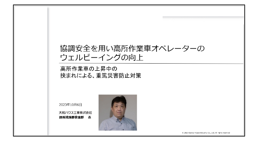 2023年10月6日に開催された、建設業労働災害防止協会主催「第60回全国建設業労働災害防止大会in広島」において、大和ハウス工業様の『高所作業車の上昇時におけるリスクの低減に極めて有効な「人間の行動特性に配慮した安全装置」の開発』に対し、1,000件を超える応募の中から唯一の顕彰を受賞されました。